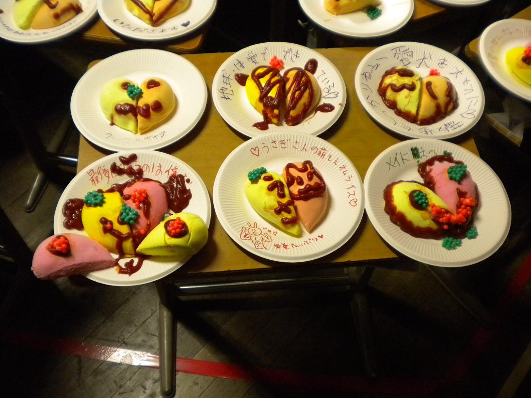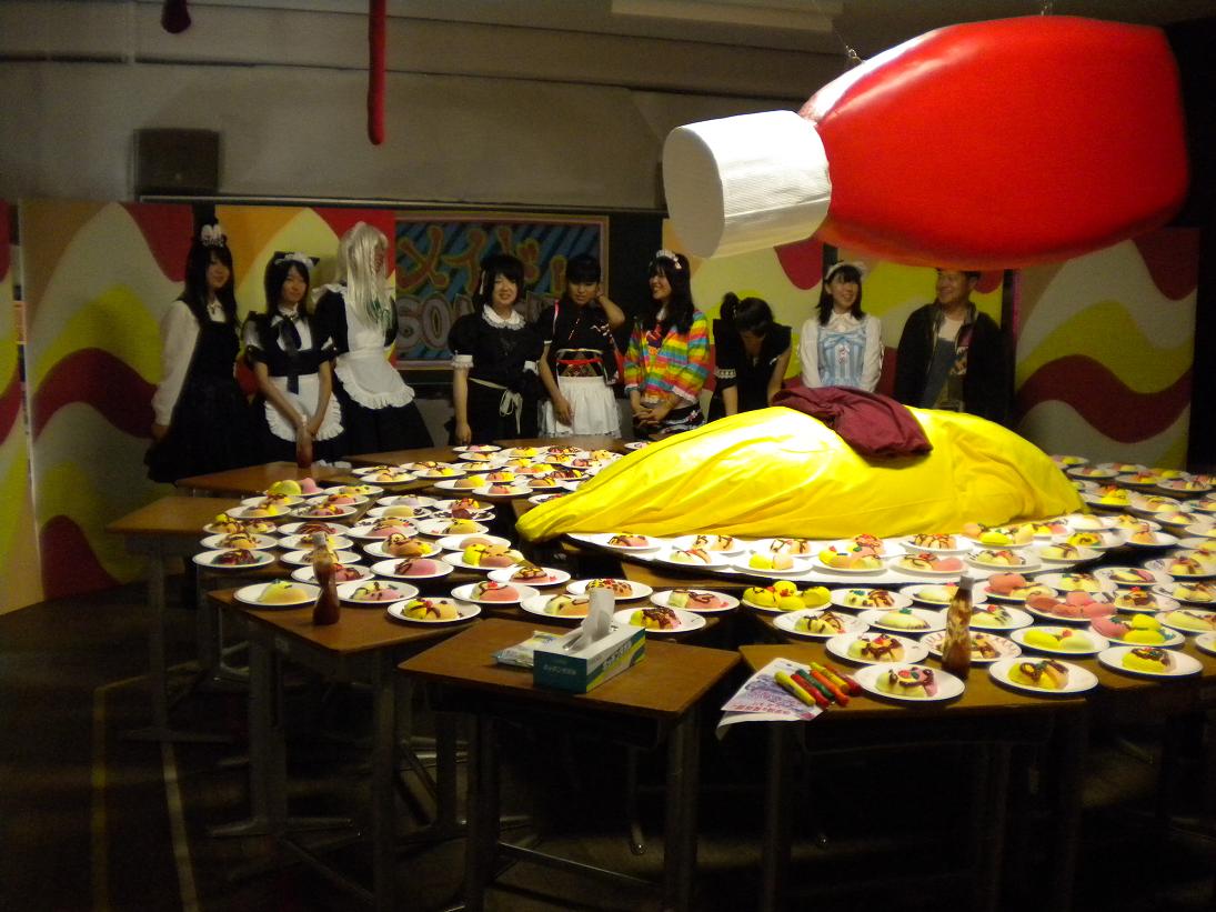 上田染谷丘の作品は、はじめ、どういう作品なのかわかりませんでした。「顧問の趣味で」と照れ笑いをする臼井先生の横には、メイドさんがたくさんいました。メイド喫茶でもやっているのか?と思っていましたが、二日目になり、その作品の意図がはっきりしてきました。写真のように、お客さんが、紙粘土のオムライスにケチャップでメッセージを書いていく作品だったのです。