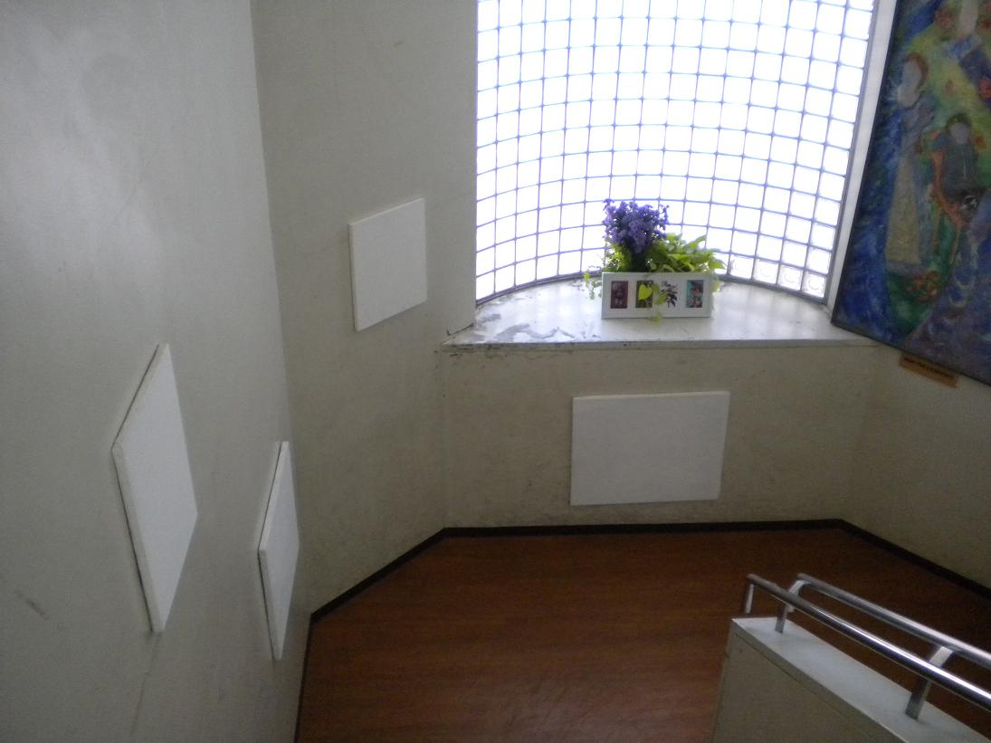 南校舎を入ると、階段には、真っ白で何も描かれていないキャンバスが。真っ白って、なんというか、何か描きたくなるというか、なぞと言うか、なんで描いてないんだろうというか・・、いろいろなことを考えさせます。会場に入ってすぐなので、展示に対する期待感が膨らみます。何かが起こりそう。
