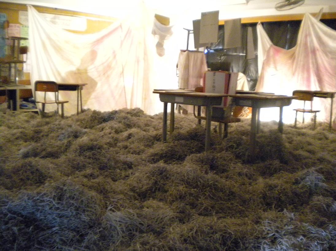 高校生のコンセプトの深さと大胆さを感じさせる作品。教室内全てがシュレッダーで占領されています。奥には、人間の姿のような影が。なんというか、教室を、紙ではなく、何かが占領、埋め尽くしている感じ。かなり、息苦しい。息苦しさが教室に充満している。よくぞここまで埋め尽くしたという爽快感も感じます。ここまでいぇってくれると主催者として嬉しい限りです。