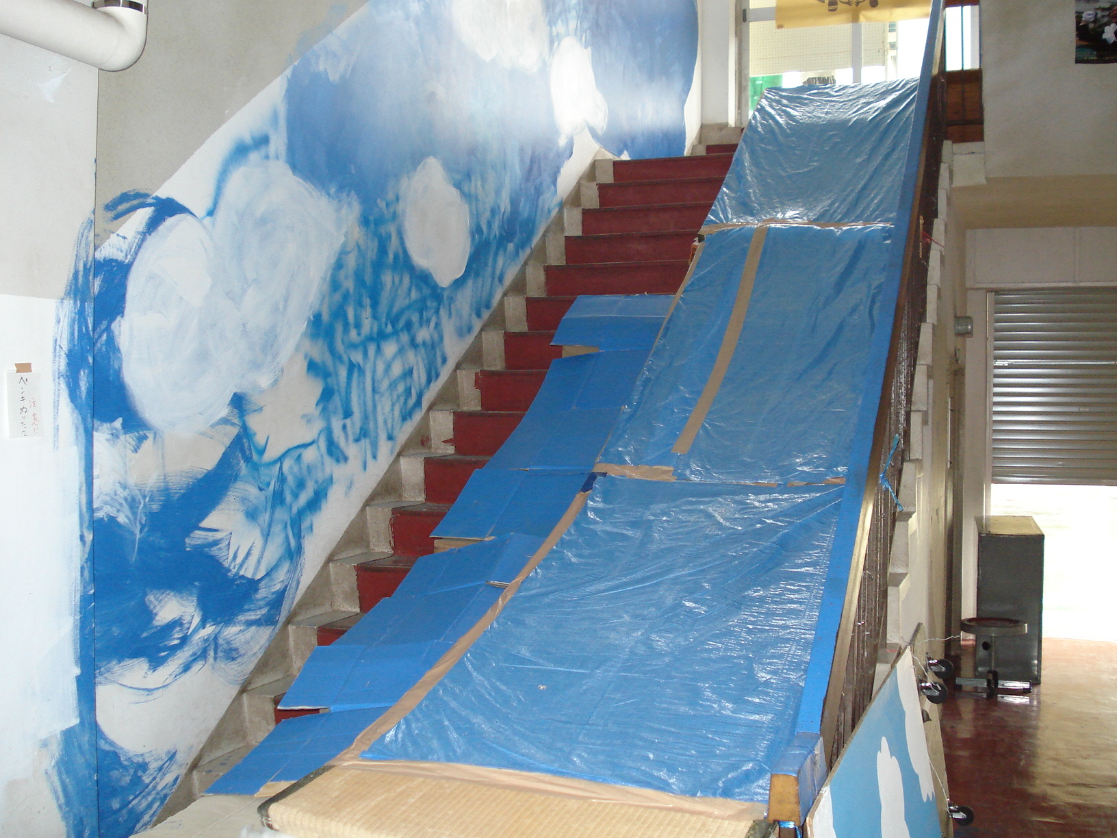 さくらびアートプロジェクトでは、校舎が改築されるという絶好のタイミングで行うことができたので、いつもより大胆かつダイナミックに活動しました。美術大学の学生さんに協力していただき、中学生が考える「こんなことが学校でできたらいいなあ、面白いなあ」と考えるアイデアを本当に実現してしまうことができました。写真は、学校の階段を滑り台にしてしまった作品「オウチューランド」。実際にやってみると「すごく大変だった」と生徒が言っている通り、やってみるととても制作は大変でしたが、担当した男子キッズ学芸員の感想には「美術がもっと好きになった」と書かれていました。また、プロジェクトに参加したほとんどの生徒の感想に「美術は気持ちを伝える」と書かれていました。プロジェクト中に、何百人というお客さんと触れ合うことを通して、本当に「何かが伝わった」という実感があったんだと思います。これは、必修授業だけでは不可能だと思いました。そこに、アートプロジェクトの可能性があると思いました。