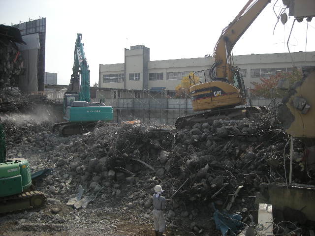 今年の廃材は、なんといっても「校舎」!!校舎のかけらが画材です。写真のようなコンクリートの塊や、壁材、水道の蛇口など、生徒にとっては、とても興味深いようです。美術部員が、それらの一見単なるごみをどう料理するか楽しみです。