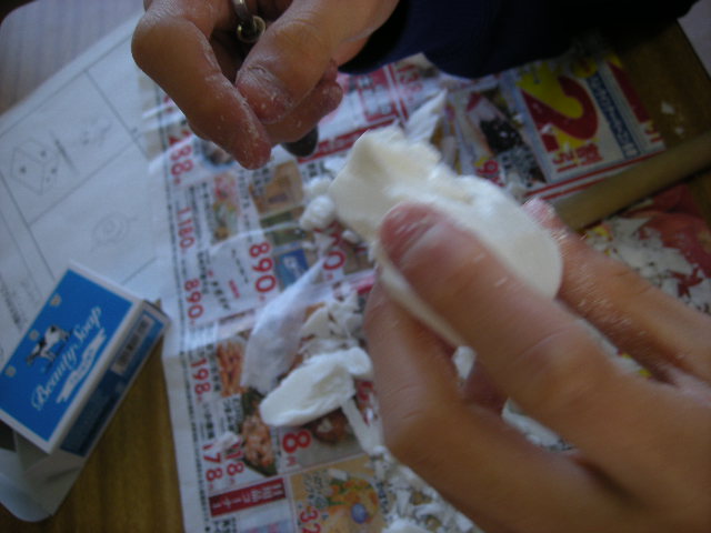 「触ると気持ちいい石鹸」という題材です。「どんな感触にしたいか?」というテーマでアイデアを考えて彫っていきます。感触を主題にすると、不思議と抽象的な造形になってしまいます。また、石鹸は彫り心地抜群などで、多少間違えても、意欲は下がらずどんんどん彫ったり磨いたりできます。さらに、磨くと、大理石もびっくり!!なくらい光ります。5時間題材です。