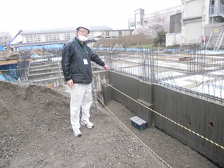 写真の場所に、設置しました。5月連休明けに、土砂で埋められるそうです。工事の方のお話によると、設置場所は、校舎の下ではなく、校舎窓際の柱根元だそうです。