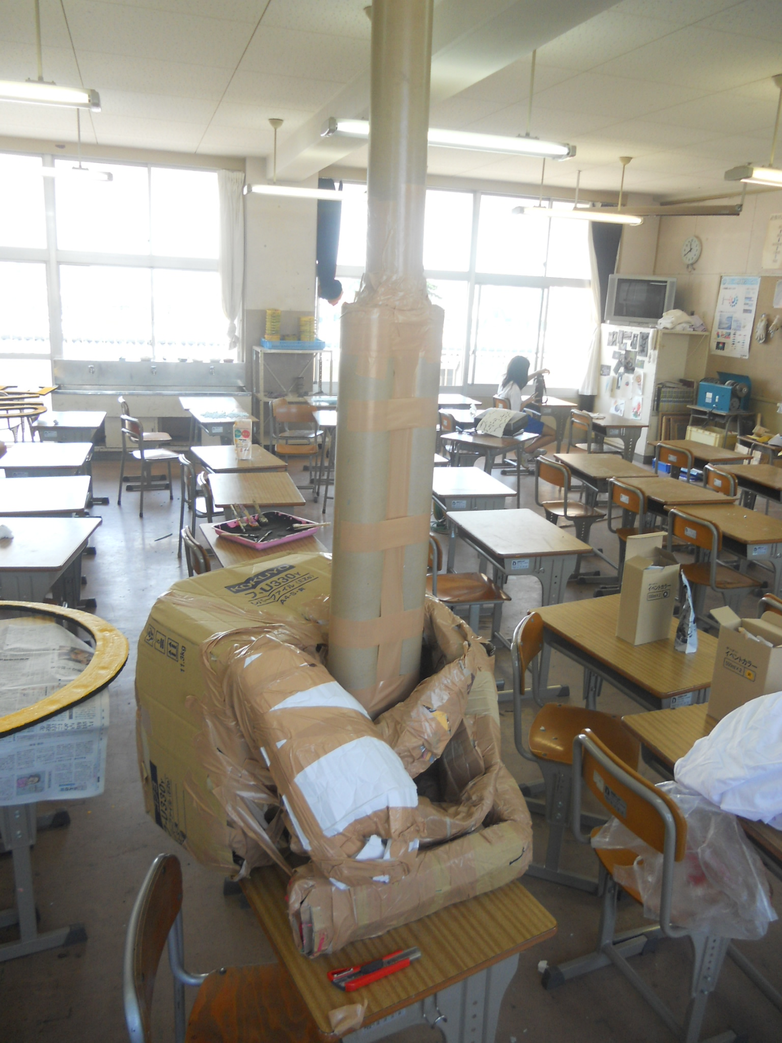 段ボールや新聞紙、ロール紙の心材などを組み合わせて作っています。