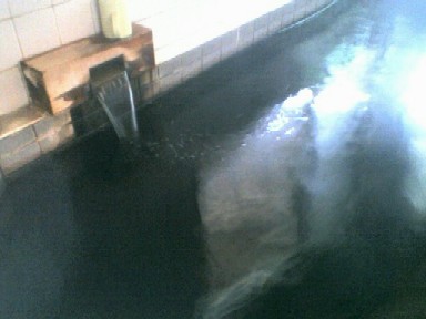 「馬場温泉」は国道47号線沿いにあって、古川方面から行くと最初に見えてきます。お湯は黒湯で、庭にもなかなかすごいお風呂があります。