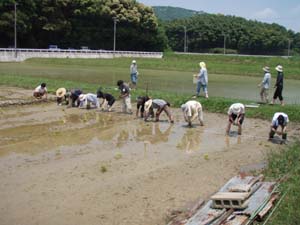 強い太陽が青葉若葉に照りつける初夏である。素足に泥の感触も心地よい。今年もにぎやかに田植えを楽しんだ。