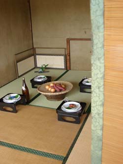 日の出亭の一階和室に富田ママのおもてなし空間ができあがった。日の出亭の歴史がそれぞれのお膳に表現されている。