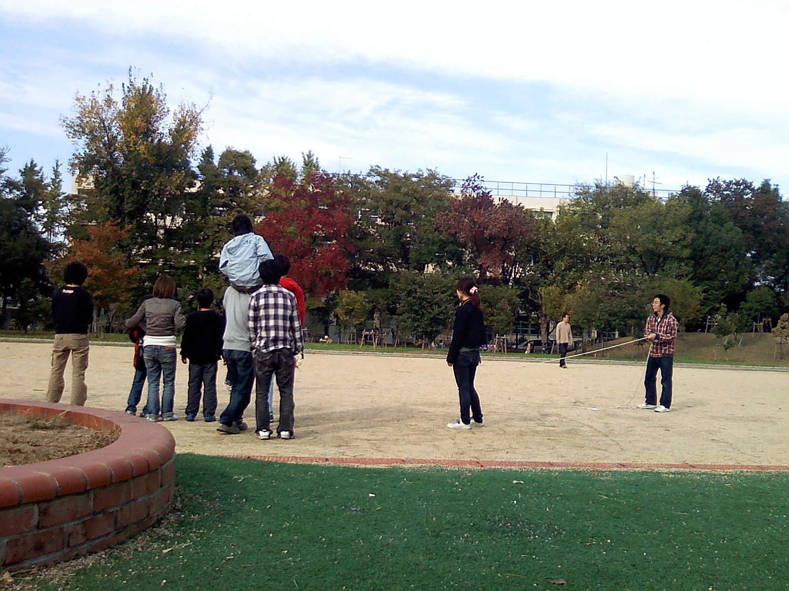 緑地ではお弁当をみんなで食べた後、大縄にチャレンジしました。難しいかな・・と思っていた大縄でしたが、縄を回し始めると、みんな何がしか気になる様子で、学生さんたちの声かけもあって、縄にふれたり、跳んでみたり、ひっかかりに来てみたりしていました。
