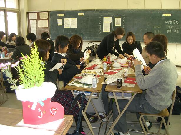 (%ひよこ%)みんな結構真剣に花器を作ってくれて、持って帰りたいという生徒も多く、花と一緒に持って帰りました。後は、学校や市民活動センターに置くことに・・・