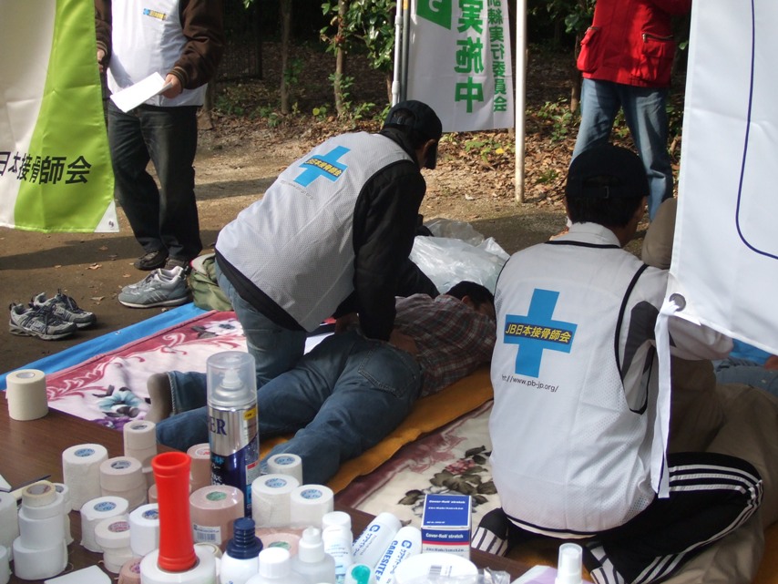巨大災害の本番を想定すると、ステーションの場所の確保、要員の確保、救急体制、水の補給体制、トイレの確保などが課題になると思われます。特にトイレの確保は大きな課題だと感じました。(写真中段は、エイドステーションでマッサージを受ける参加者)