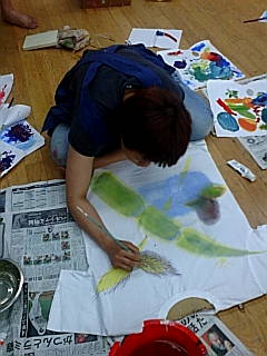 制作を担当するのは洋画コースの竹沢君。まさに「腕をふるって」Tシャツを描きあげています。