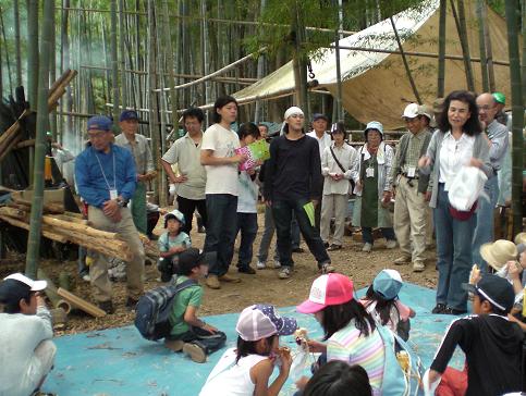 この日は、大山崎竹林ボランティアの皆さんによる「流しそうめん大会」が行われていたので、その場で子どもたちに翌日のワークショップのPRを展開。