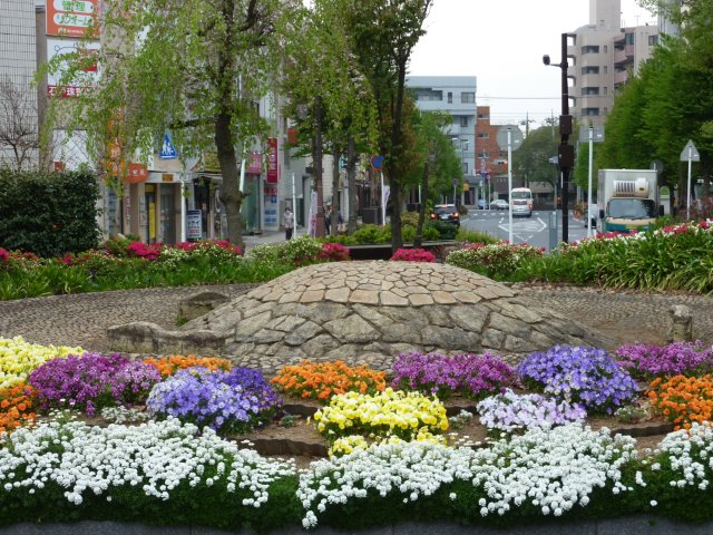 (%星%)天候不順の4月ですが、駅前花壇は今、春爛漫、とてもきれいに花が広がっています。パンジーの手前のイベリスが大きくなって純白の花を一杯つけて華やかです。今年の花壇はパンジーを円形に配して、その間にアリッサムを植えるつもりでしたが、アリッサムの成長が遅く間に合いませんでした。(%音符2%)