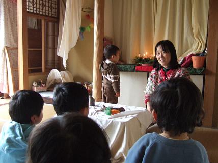 クリスマスリースに立てたみつろうろうそくに火を灯したらお話の時間です。