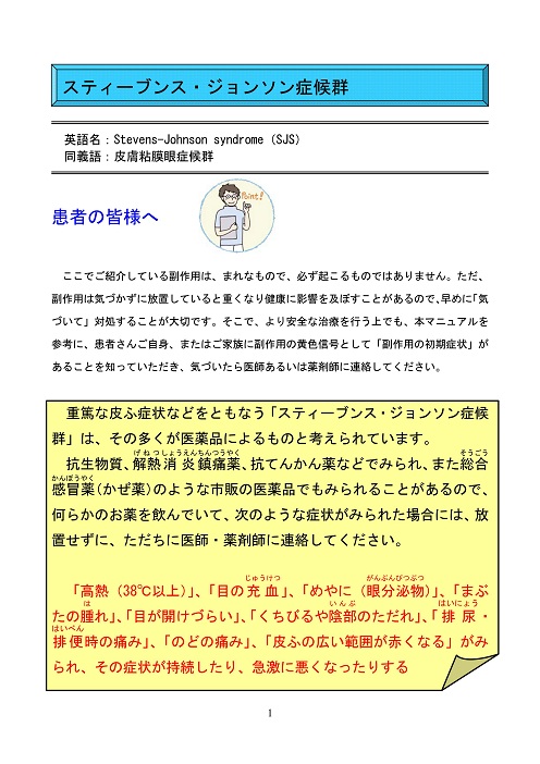 抗生物質、解熱消 炎鎮痛薬、抗てんかん薬などでみられ、また総合感冒薬(かぜ薬)のような市販の医薬品でもみられることがあるので、何らかのお薬を飲んでいて、次のような症状がみられた場合には、放置せずに、ただちに医師・薬剤師に連絡してください。
