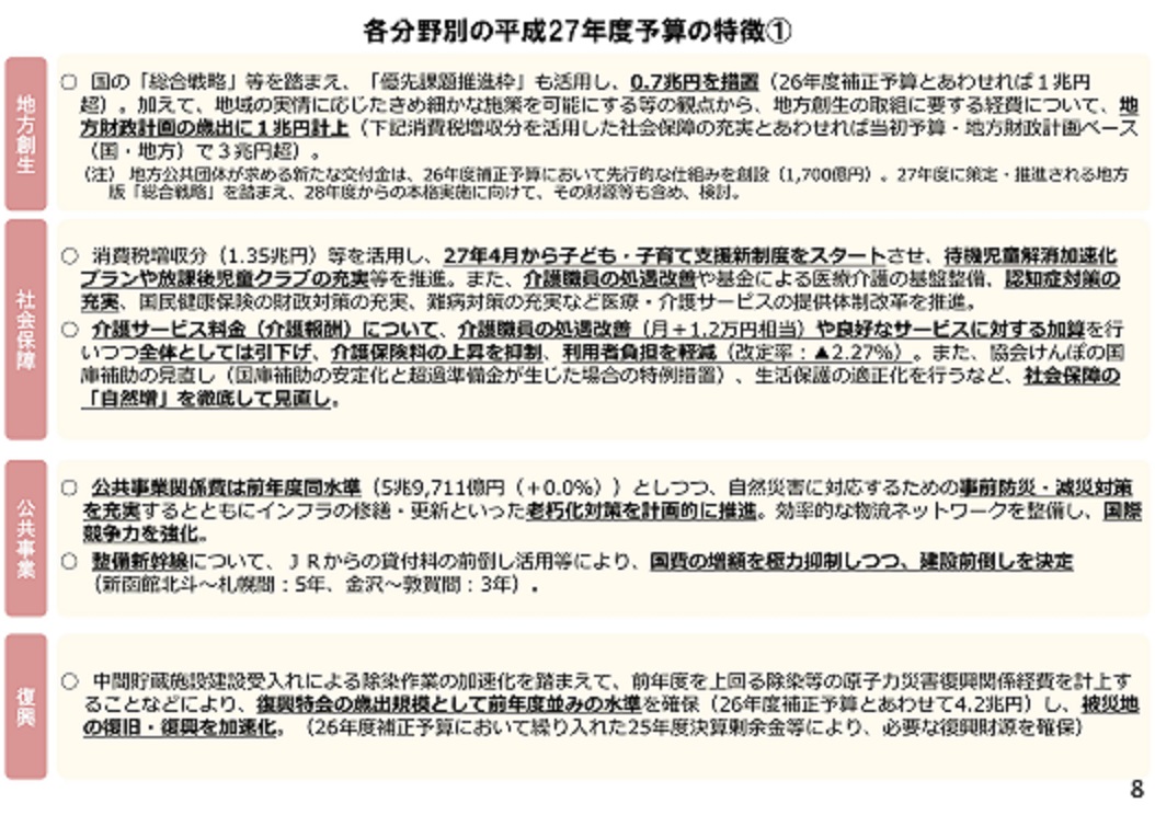 2015年度予算案は、安倍政権が力を入れる地方創生や経済成長に向けた政策、子育て支援などに重点配分した。