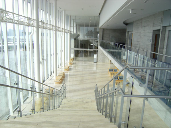 私が調べたところ、小野田はすばらしいブナ林があるそうで、この会場となる文化センター前面が1月には雪で一面真っ白になるというのを聞き、この白い柱のガラスばりの建物の中に緑の毛糸を結ぶことで、真っ白な冬にブナの新緑を一時的に出現させる、というようなアイデアを考えました。