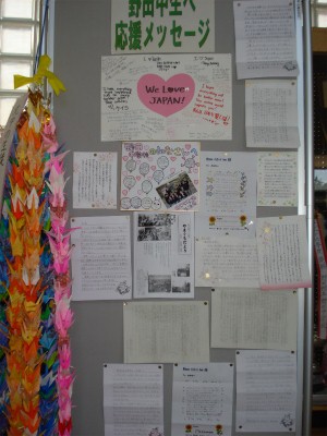 西宮市立山口中学校の生徒会が中心になって集めた募金とメッセージを手渡しました。校長先生は「大会に出る被災生徒達の学校指定ジャージを購入したりしたい」と仰っていました。メッセージは玄関に飾られ、2度目に尋ねたときは体育大会の準備中でしたが、野田中学校3年担当の先生から「募金やメッセージを戴き、生徒達が自発的に返事を書きました」と伺いました。阪神大震災の体験から、メッセージを読んでもらうだけでも大変なので返事など求めてはいけないと思っています。西宮の中学校では事前に充分話し合い募金も集めたそうですが、そんな気持ちが通じたのでしょうか。今後は山口中学校だけでなく他の西宮市内中学校とも交流が出来ればと思います。