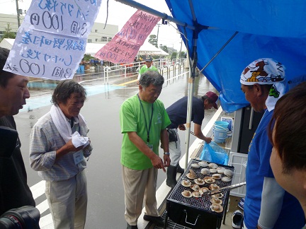 また、「刈羽焼き」の屋台。実は、大阪上町台地から器具を調達し、大阪のいか焼きをヒントに、刈羽の野菜とベーコンを米粉で仕上げるという新作地元メニュー。もっちり感が嬉しい逸品で、15時の終了時間まで列が途切れませんでした。実は、大阪上町台地屋台村の皆さんと刈羽村とは、中越沖地震では繋がっておられませんでした。先日、上町台地の皆さんが野田村を訪問されたときに、ちょうど刈羽村からも野田村を訪問されていました。そこで、上町屋台で販売されていた大阪のいか焼き(注:いかの姿焼きとは“異なります”!)をご覧になった刈羽村の方々が、いか焼き器の購入と上町台地屋台村の皆さんの招聘をその場で決定。今回のイベントにつながって行きました。大盛況のうちに終了。地元のボランティアさんと一緒に反省会を開き、互いの再会を祈念してそれぞれ帰宅の途につきました。