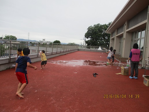 同避難所では震災前から指定管理者としてかかわっているWMCAが、発災後間もなくテニスコートで「プレイパーク」を実施していた。4月末訪れたときは担当者が「本来のプレーパークかどうかはわからないが」とおっしゃっていたが、中高生ものびのびとバスケットボールやテニスを楽しんでいた。ただ、乳幼児や小学校低学年の遊び場としては担当者も「ちょっと危ないので」とのことで、屋内の遊び場(キッズルーム)しかなった。今は「プレイパークは小学生以上」と表示されていた。そこで乳幼児の外遊びのきっかけになればと実施。あいにくの雨で3人しか来なかったが、5月末までテント生活だったという保護者は楽しく遊ぶ我が子に嬉しそうだった。ただ小学生3年生の男の子はおいてあるお菓子を何気なくとったり、この後もボランティアの学生にまとわりついて彼のポケットをまさぐったりと、ちょっと気になる行動が見られた。