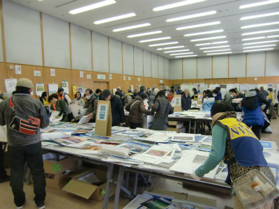 1月7日(土)〜9日(月・祝)の3日間、恒例となりました「第21回チャリティカレンダー市」を西宮市役所東館8階の大ホールにて開催させていただきました。1月5日(木)と6日(金)の2日間でカレンダーの受入をさせていただきましたが、今回も全国の企業や個人の皆様から昨年と同じぐらいたくさんのカレンダーや手帳が届きました。届いたカレンダーをボランティアのみなさんで段ボールを開封しカレンダーを広げていただき、まず、風景や乗り物、動物や数字などの分野ごとに分類していき、それから、会場のテーブルに並べていきました。一般のコーナーと高額のコーナーとに分けて準備をしていきました。高額のコーナーには、数が少なくて人気のある皇室や大相撲、アニメやタレントなどを分類させていただきました。