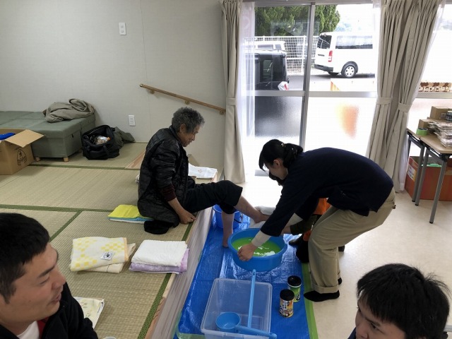 翌日は、真備の市場仮設団地集会所でお茶会+物資配付+足湯を行いました。午後の2時間程度でしたが、管理してくださっているYさんご夫妻によくして頂きながら、いわゆる常連さんも含めて、20人程度で和やかな場になりました。足湯には男性4名、女性1名。高齢の男性からは、水が入ったときの様子をじっくりと聴かせていただきました。別の男性からは日頃の健康管理や孫の話。私自身は、久しぶりに足湯をやりましたが、やはり色々なお話が伺える優れたツールだと改めて感じました。今回、参加してくださったグリーンコープさん、倉敷市職員と話し、次回は、グリーンコープさんと協働して餅つきとお茶会のような場をもつことにしました。