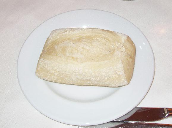 スペイン南部のコルドバからセビリアに向かう途中、カルモナの丘の上にそびえ立つ古城「パラドール・デ・カルモナ」での昼食のパンです。パラドールというのは、古城など史跡を改造した国営のホテルです。丸いロールパンを上から十字にカットしたものと思われます。表面はフランスパンのように堅いですが、中に気泡はありません。
