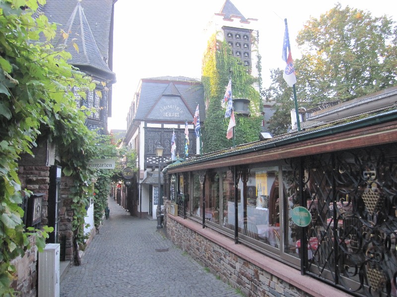 ようやくホテル(トラウベ・アミューラ)に入りました。しかし、目の前がライン川という絶好のロケーションにあるホテルです。部屋にジィーとしているわけにはいきません。しかも、ホテルから1〜2分も歩けば、つぐみ横丁です。本当に狭い小径ですが、レストランや飲み屋さんがひしめいて、どこも宿泊する観光客で混み合っていました。