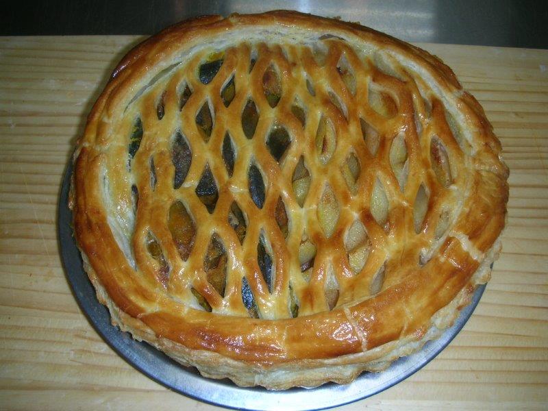 かぼちゃ&りんご ハーフ&ハーフのパイタルト。八郷小倉あんパイ・りんごパイは表面を焼き、粉を掛ける。キッシュのタルト 18センチ ホールは、参加者のお腹に入りました。