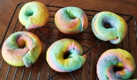 会員のNさんが作ったベーグルです。 生地のつくり方はいつも通りですが、捏ね上げた生地を分割し、それぞれに異なる嫡子色をして組み合わせたものです。 まさに、7色のレインボーパンです。
