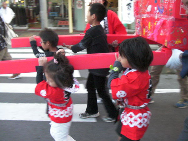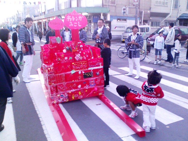 岩見沢市最大のお祭り「百餅祭り」でわく四条通りを今、プラダンでつくった赤レンガみこしがかつがれていきます!