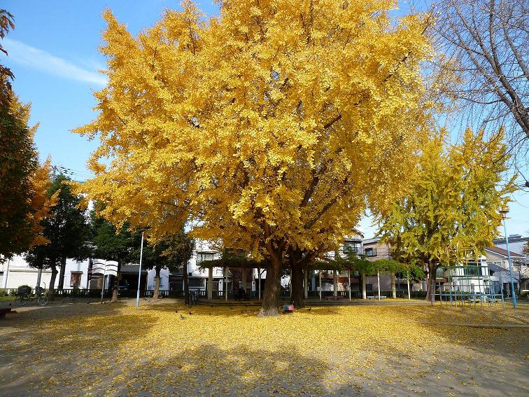 つけた、公園の大銀杏の木、初冬に、周りを輝かせるように、