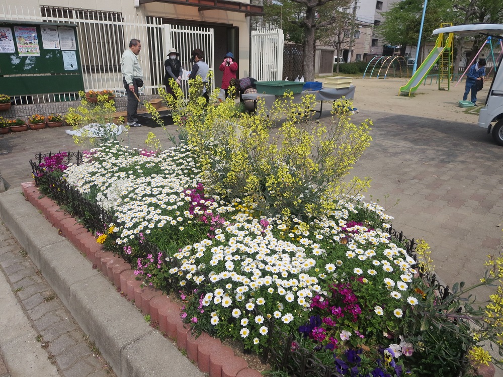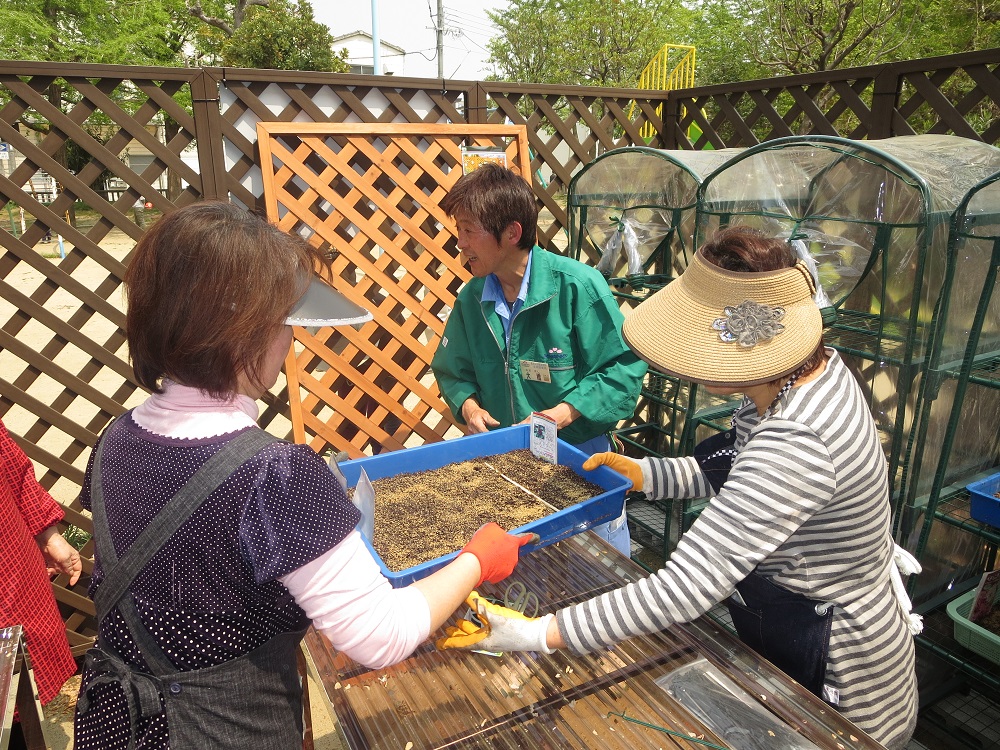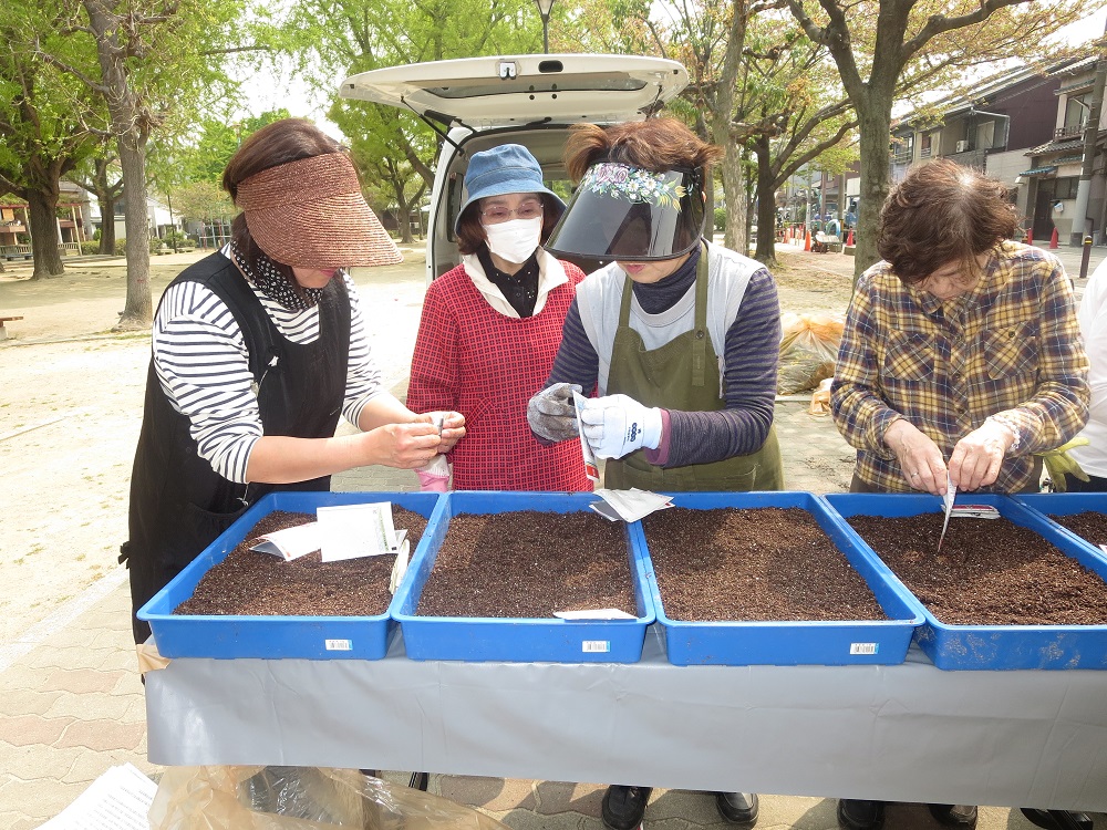 所の協力を得て、花と緑部会のメンバーが種花を植え