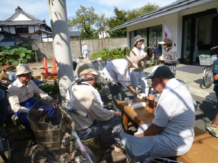 水分補給!!まずは藤棚の下で、麦茶をグッと1杯