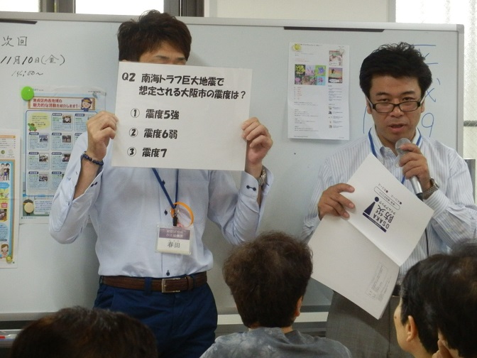 脳トレニングのあと、防災のクイズを区役所防災担当藤原さんと春田さんがしてくださました。
