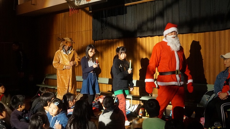 場内を暗くして代表の女の子と、サンタ・トナカイの入場