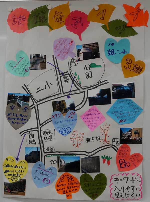 こちらのマップも、季節感の溢れる、ワクワクする一枚に仕上がっています。フィールドワーク中は、「どうやって子どもたちに教えたらよいか」と指導員に積極的に質問も頂いたようです。地域安全マップの魅力は、聞くだけではなかなか伝わらない部分もあるのですが、今回実際に体験して頂いたことで、その魅力を体感して頂けたように思います。「人生は常に学びだが、今回の経験も非常に勉強になったという感想も頂きました。