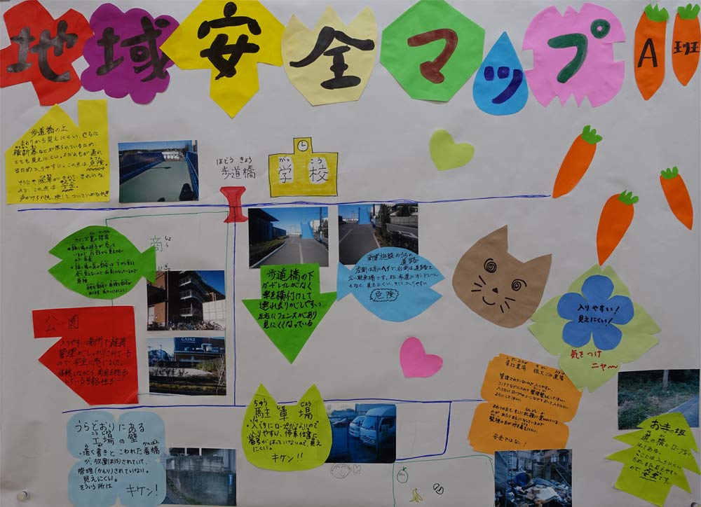 フィールドワークでは、初めて参加された方もベテランの方も、「講義の時に聞いたのはこういう景色に近いかもしれない」とか「この道はかえって油断しそうで危ない」など、様々な視点で意見を出し合っていました。「騙し」の手口の話などもして、リアリティのある内容になったと思います。マップ作りも楽しそうに取り組んでいました。発表会では、「子どもをどうやって守ったら良いかずっと考えていたので、参加して良かった」「想像していたよりも楽しかった」「なにより協力してできるのが良い」「景色を見て気づきがあった」などの感想をいただきました。子どもたちが読みやすいようにとルビを振ったりイラストを付けたり…と、工夫も見られます。