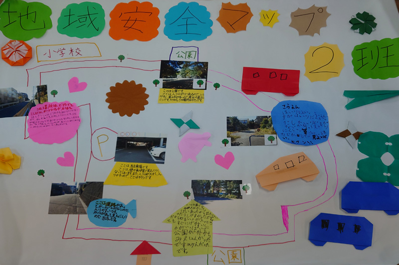 未就学児童から高学年までと、学年はバラバラでしたが、みんなで最後まで協力してマップを完成させました。フィールドワークでは、「ゴミは危険のサインだから」と、自分からごみを拾う姿も。「カーブの先が見えにくい」など、事前学習では触れなかったことにも気付いてくれました。「完成したマップ持って帰りたい」と言ってくれる子もいました。