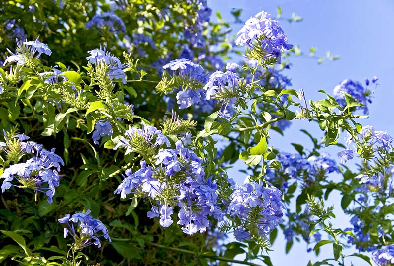 イソマツ科の花で、正式名は「ブルンバーゴ」と呼ばれています。青紫と白色の2色がありますが、2色並べて玄関先に植えられている姿は見栄えがします。