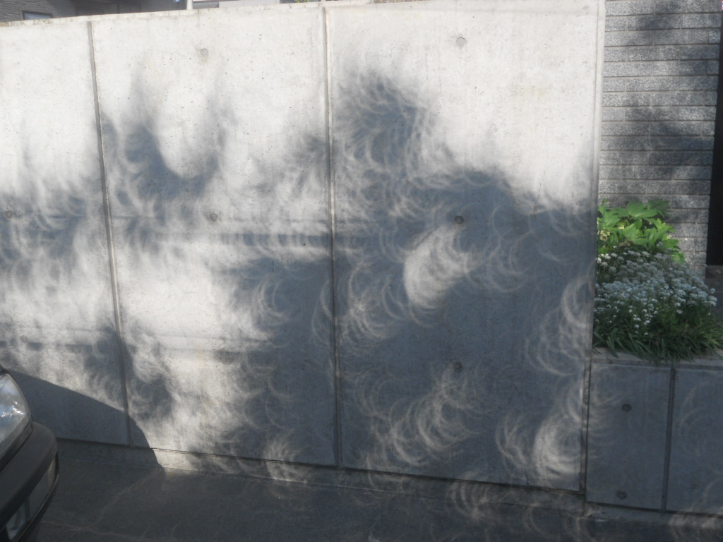 ちょうど今日は、朝の登校指導があったので、金環日食の時間に歩道を歩いていました、すると、写真のような美しい模様がご近所の住宅の壁に写っているではありませんか!!
