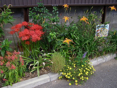 ブルーサルビア、百日草、鶏頭、ヘメロカリス、