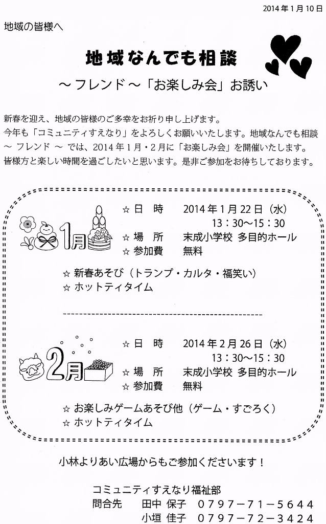 来る1月22日(水)と2月26日(水)に 「地域なんでも相談」では地域の皆様に親しみを持って頂く為に [お楽しみ会]を開催します。
