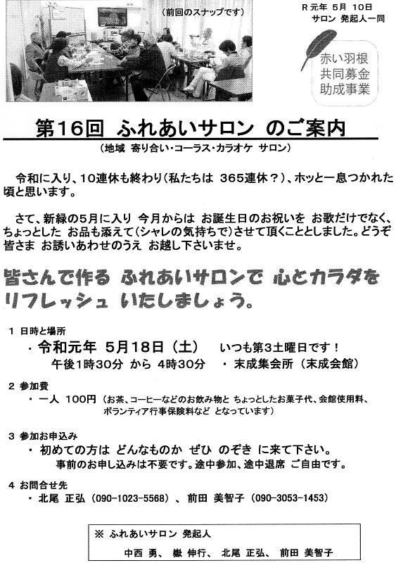 来る5月18日(土)午後1時30分から 末成集会所にて、 『ふれあいサロン』 が開催され、みんなでカラオケで歌います。