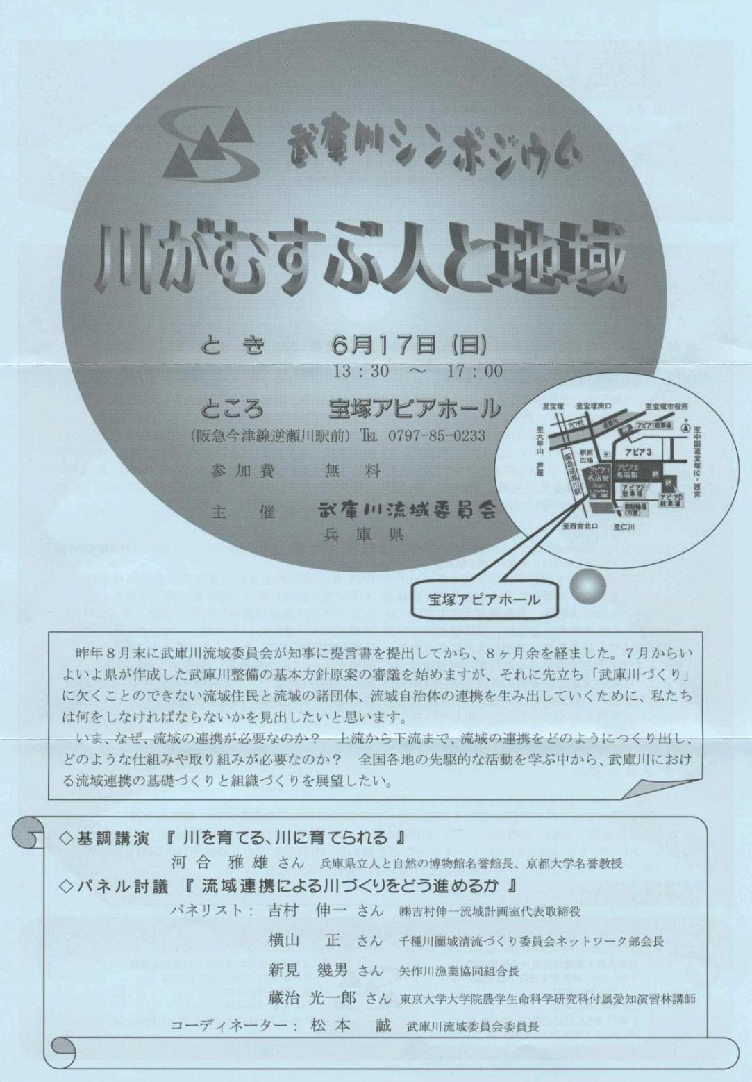 (%ハート%)(%ハート%) 武庫川シンポジウムを開催するチラシが送られてきた。基調講演 「川を育てる、川に育てられる」、パネル討議 「流域連携による川づくりをどう進めるか」 が行われる。