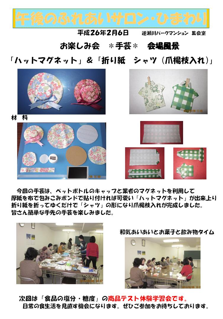 (%ニコ女%)(%ニコ男%) ゆずり葉コミュニティ域内12箇所のサロンの内、逆瀬川パークマンションのひまわりが、2月6日(木)、手芸お楽しみ会 を開催しました。