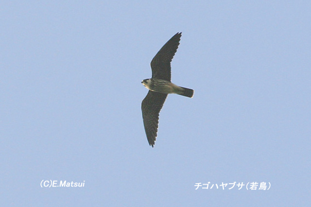 (%音符2%) チゴハヤブサ:タカ科とは違いますが同じ猛禽と呼ばれるハヤブサの仲間です。行者山では旅鳥ですが主に秋の渡りの時にしか見られません。十数年観察していますが今まで一度だけしか確認出来ませんでした。今年の秋は2回見る事が出来、やっと画像も撮れました。ハヤブサの幼鳥に似て胸の縦斑が目立ちますがハヤブサより小型で翼は細長いです。ただ飛翔型によっては見間違える事もあります。今秋に見た個体はいずれも若鳥でした。成鳥は下腹が濃いオレンジでお洒落な猛禽です。通常は東北や北海道で夏に繁殖し一部は国内でも南部で越冬するらしいですが中国南部、東南アジアで越冬します。