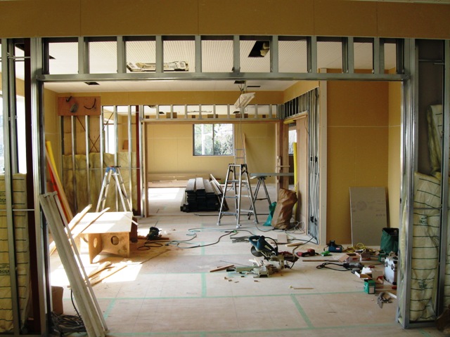 (%笑う男%)CoKoセンターの子ども館、わいわい館の内部仕切り部屋が明確に出てきました。また、各部屋の間仕切り、天井もおおむね出来上がってきました。今回は、わいわい館の部屋割りを撮ってみました。(%笑う女%)