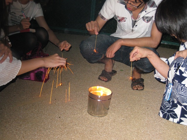 (%晴れ%)イベントのハイライトは「子ども花火大会」です。線香花火競技大会で・・・ 点火から最後までのタイムを競い合いました。誰の線香花火が長持ちするか?