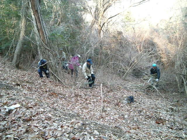 写真右上 岩石がごろごろと足場の悪い斜面でとげのある樹木に注意しながらの作業